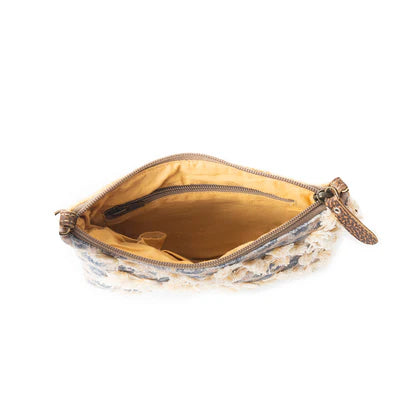 Step into bohemian chic with this charming bag. The front showcases an artisanal lattice pattern with delicate cream tassels on distressed gray upcycled canvas, while the reverse offers practical sophistication with woven upcycled canvas golden burlap texture and a secure zip pocket. Zipper-close top with detachable, adjustable shoulder strap in matching leather. Perfect for your free-spirited adventures.