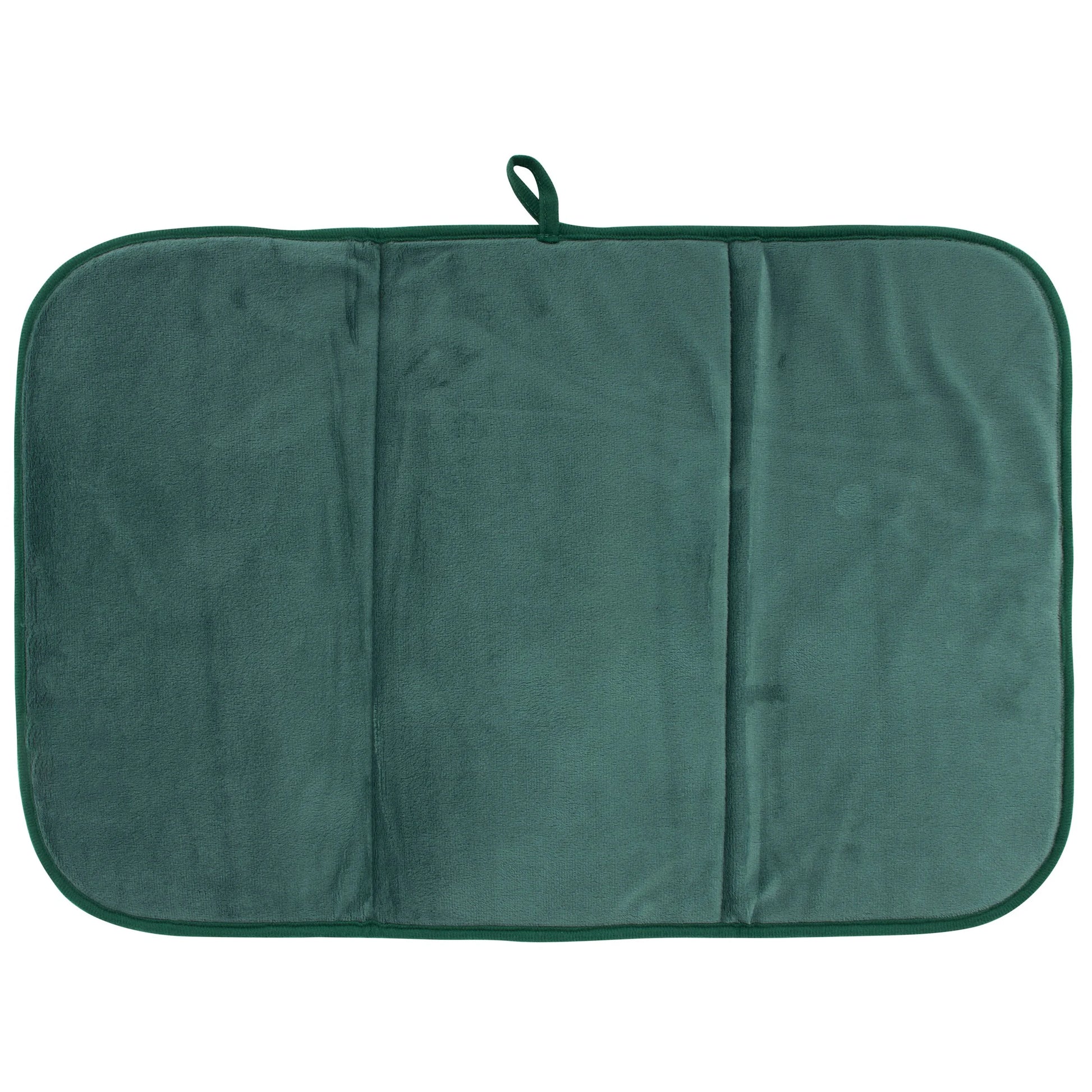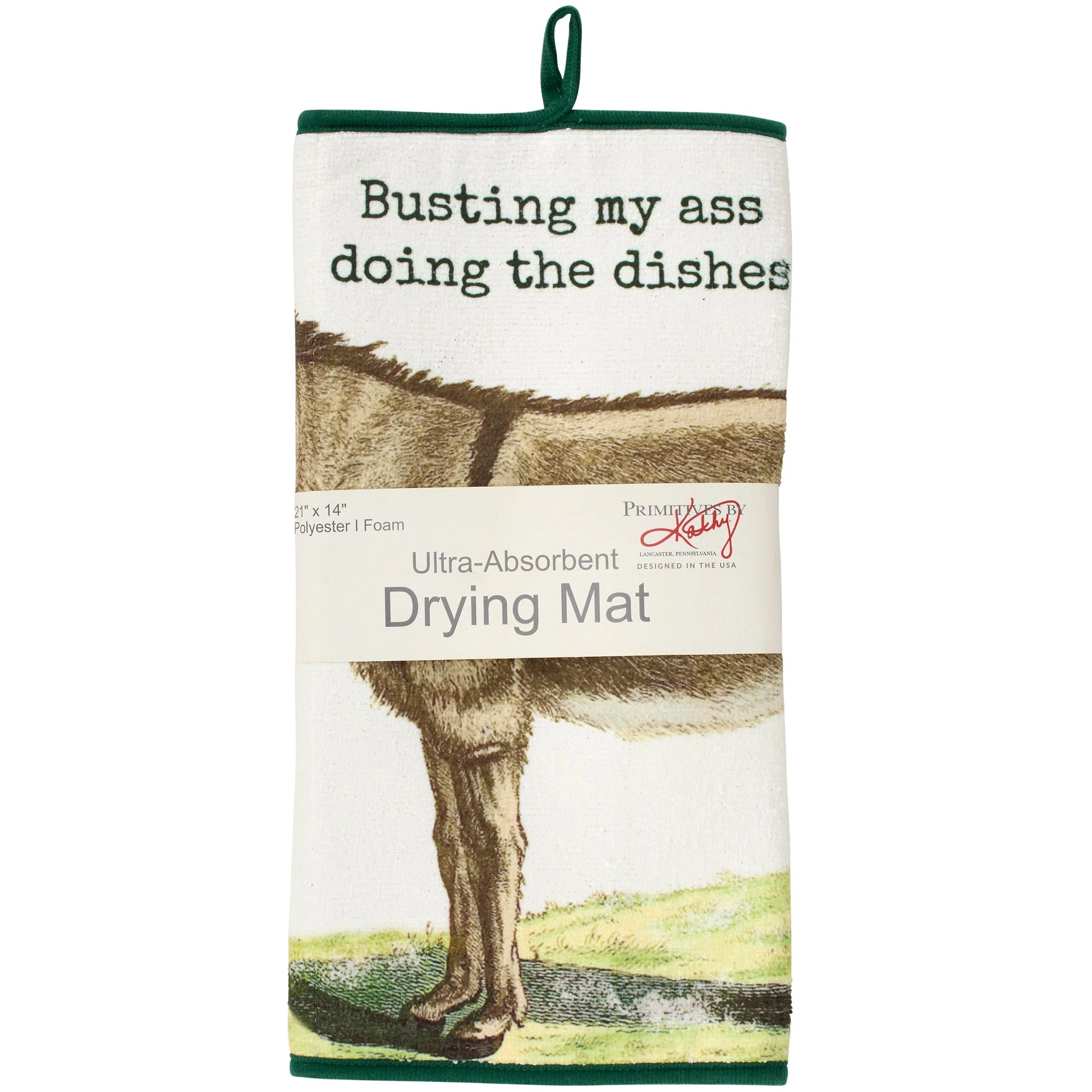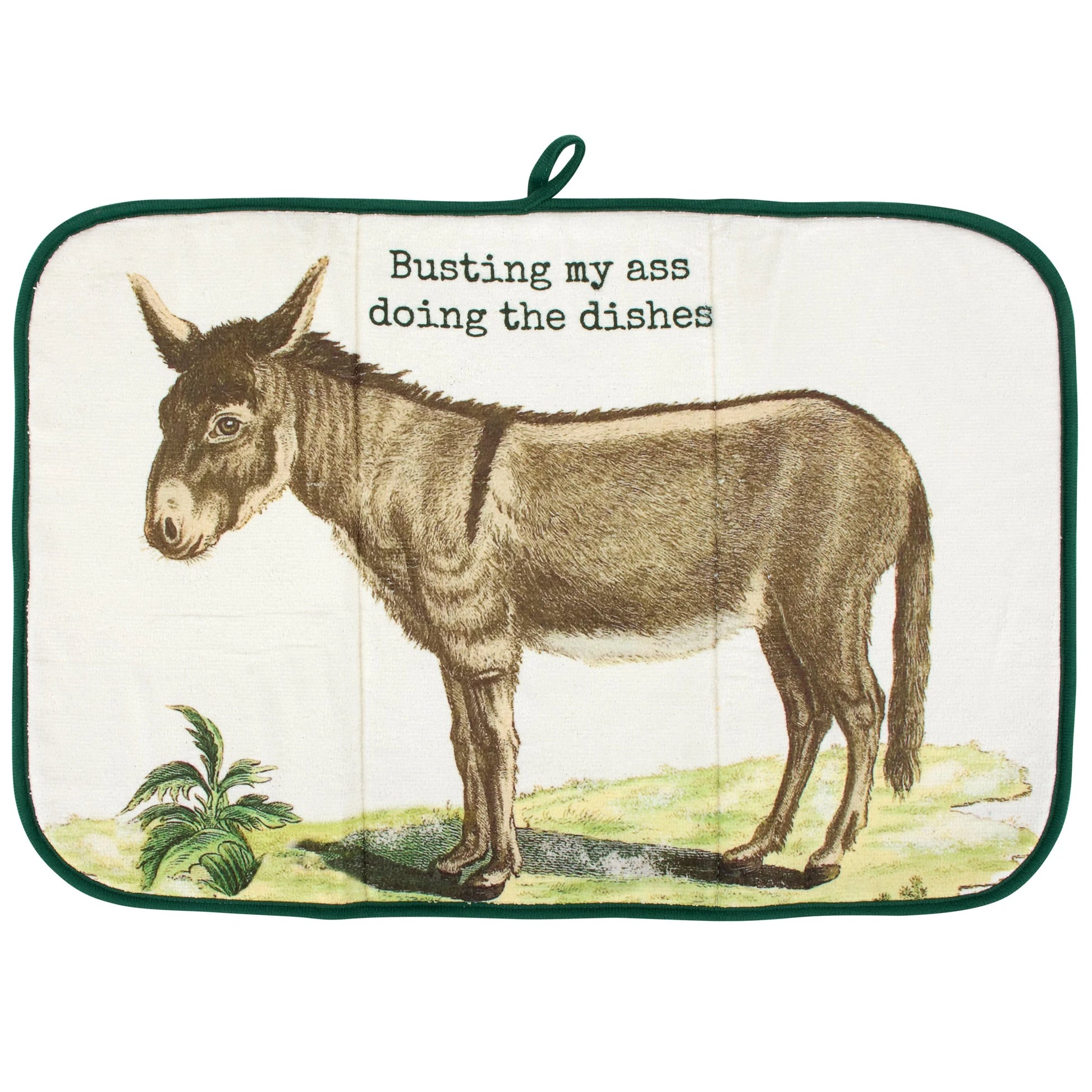 Vintage art of a donkey with a fun donkey themed pun that reads "Busting My Ass Doing The Dishes." Donkey drying mat features a full color design on the 21 inch by 14 inch space to place items for drying with a coordinating green color on the back and trim. Our Doing The Dishes drying mat includes a hanger at the top to display design or to air dry when not in use. Kitchen drying mat is conveniently machine-washable for easy cleaning and folds up for easy storage. A fun farm themed kitchen accessory perfect for everyday use