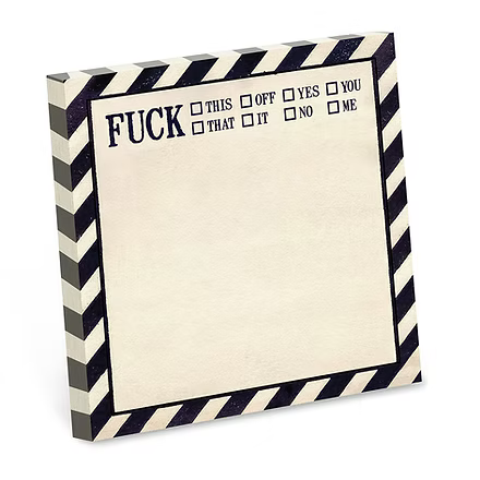 Get ready to unleash your humor with the uproariously funny "Fuck" Sticky Note Pad! Featuring check boxes for "fuck this," "fuck that," "fuck off," "fuck it," "fuck yes," "fuck no," and "fuck you," plus a special spot for "Fuck me." Express yourself with a twist of wit and a touch of profanity. Perfect for those unapologetically honest moments! Great for friends who share a similar sense of humor!