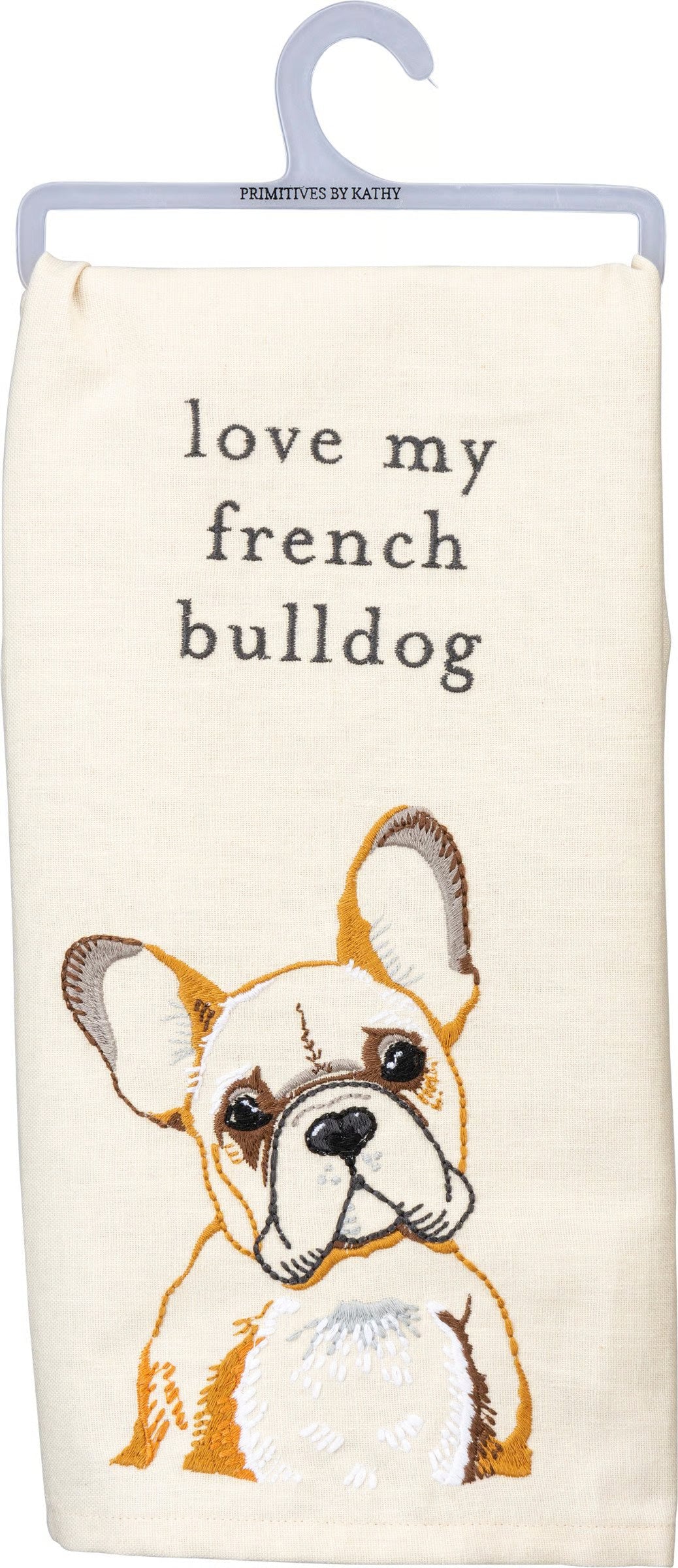 Beautifully embroidered design of a French bulldog and coordinating sentiment that reads "Love My French Bulldog." Our Love My French Bulldog kitchen towel is conveniently machine-washable for easy cleaning.