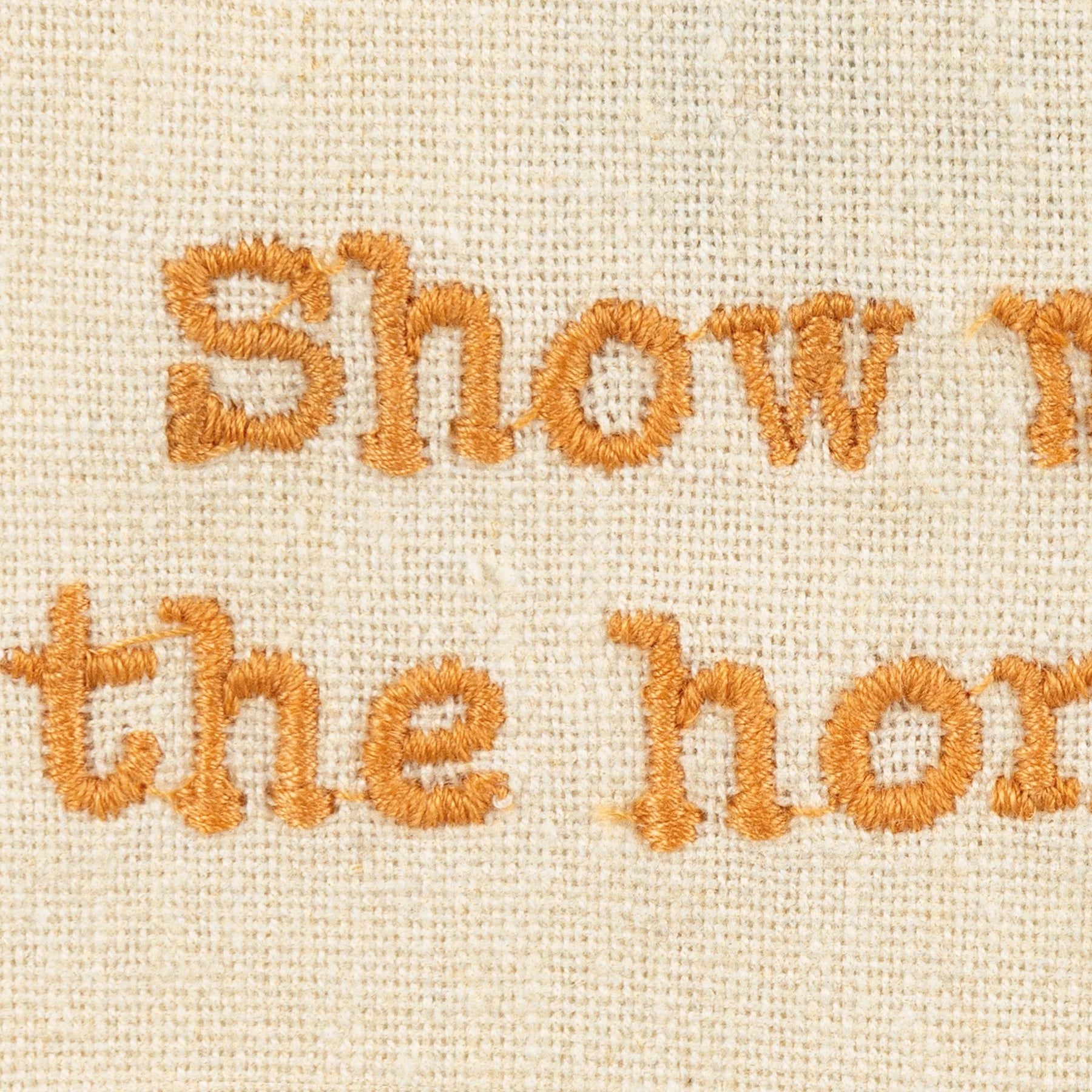 Vintage-inspired bee designs and punny embroidered "Show Me The Honey" sentiment. Features a cotton tape loop in the corner for easy hanging.