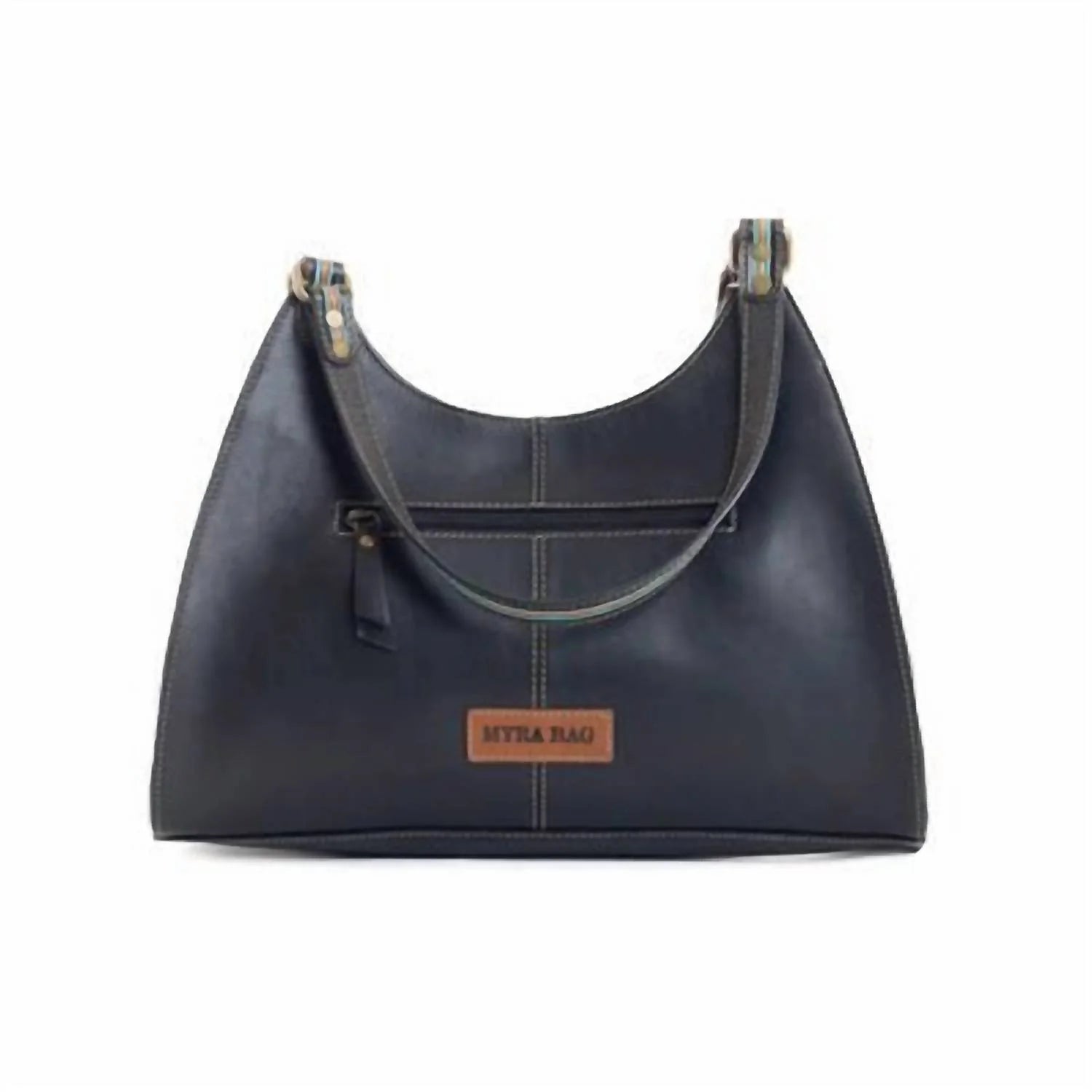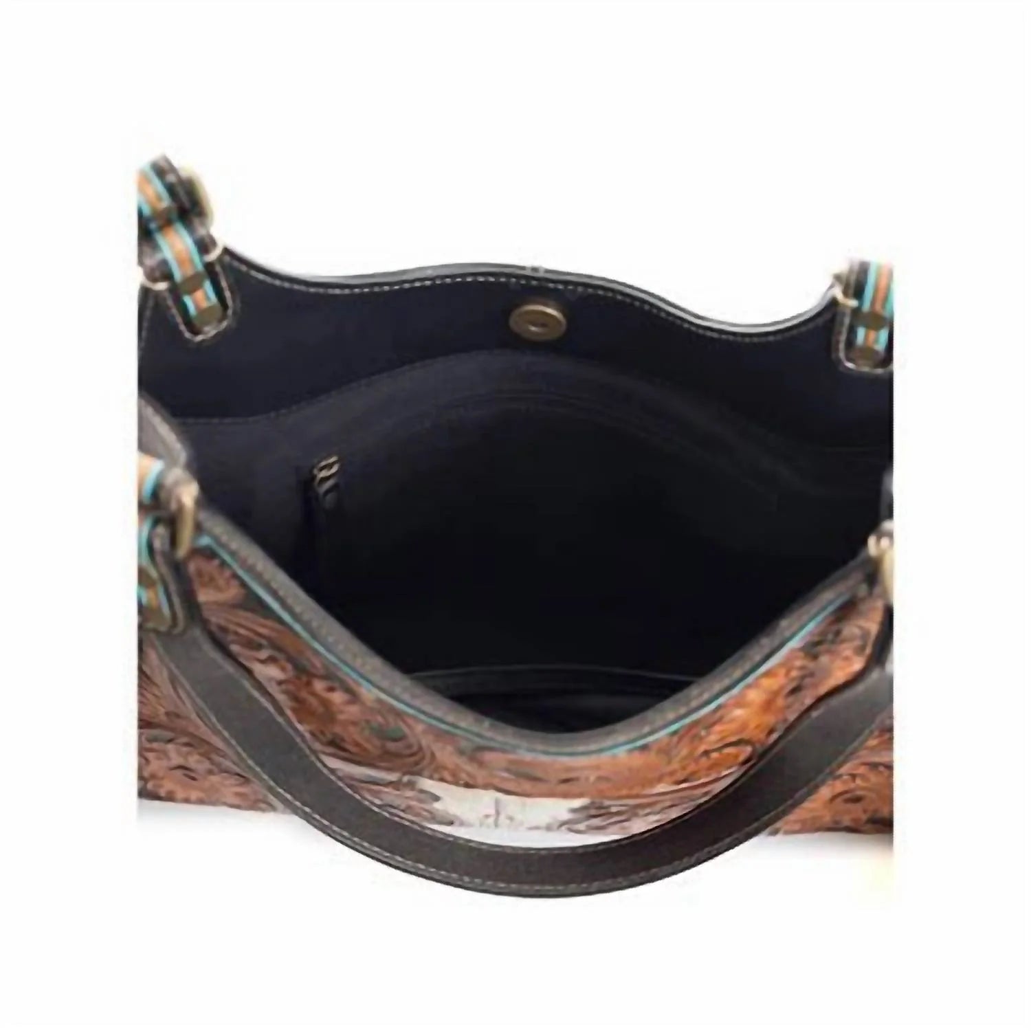 Introducing the Women's Steer Creek Trail Hand-Tooled Bag by Myra Bag, a stunning shoulder bag in rich brown leather. This exquisite bag features an eye-catching hand-tooled leather design with a turquoise-accented steer skull, complemented by sleek ebony leather on the back and sides. The interior is thoughtfully designed to carry all your essentials, secured by a convenient zipper closure and enhanced with tri-tone leather handles for style and comfort.